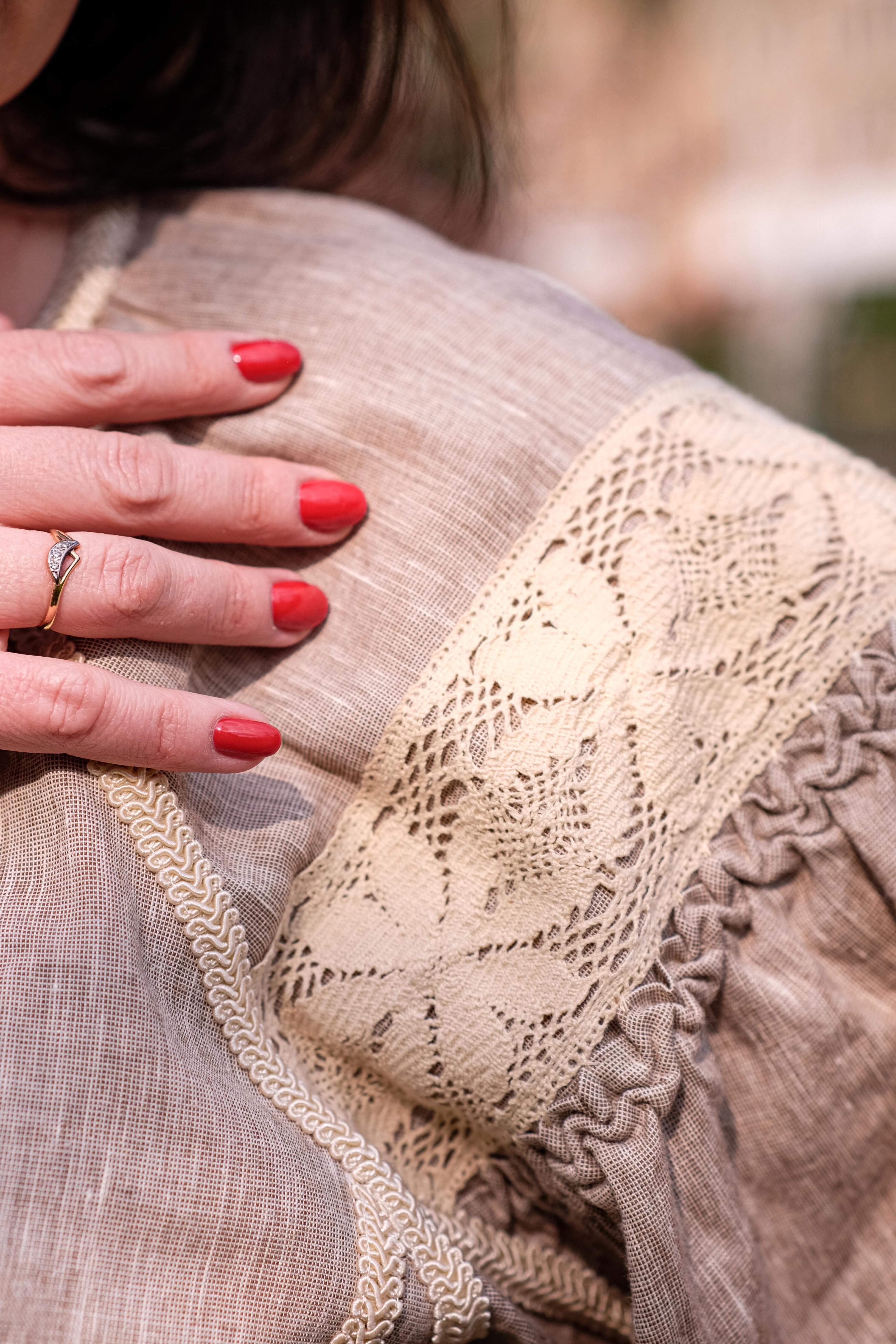 Що потрібно: тканина льон, кропива, джинс, костюмка тощо… Метраж тканини: 2 довжини виробу + довжина рукава + 30 сантиметрів. Мереживо шир. 5-7 см - 5 м (залежить від моделі, довжини). Тасьма вузька шир. 1,5 см - 9 мнитки в тон, шнур для зв’язок- 3 м, клейова, гумка шириною 5 см - 50 см.